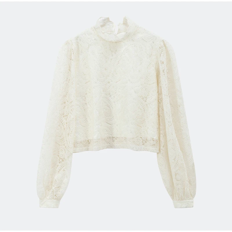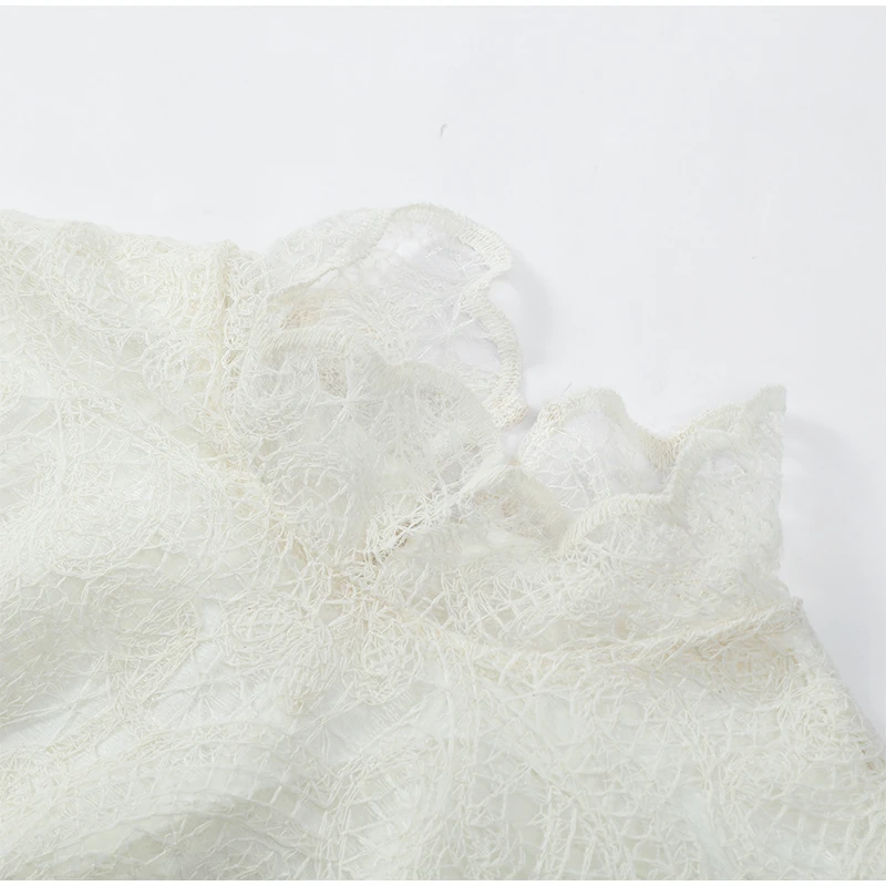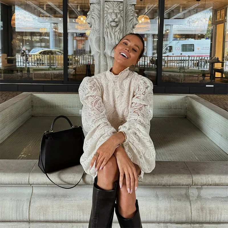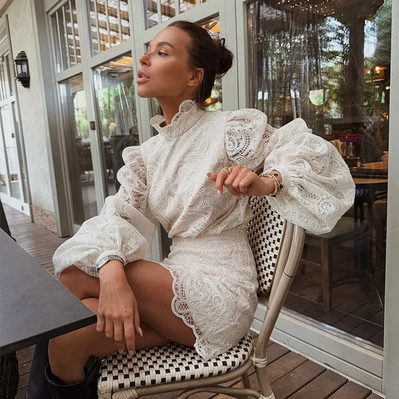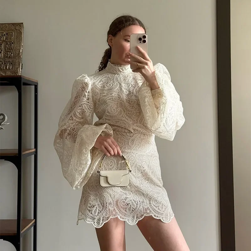 Women Lace Hollow Out Mini Dress Elegant Long Sleeve Designs Chic High Neck Short 2026 Trendy Spring Club Night Gown